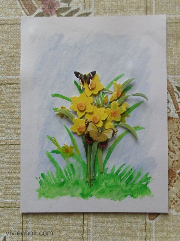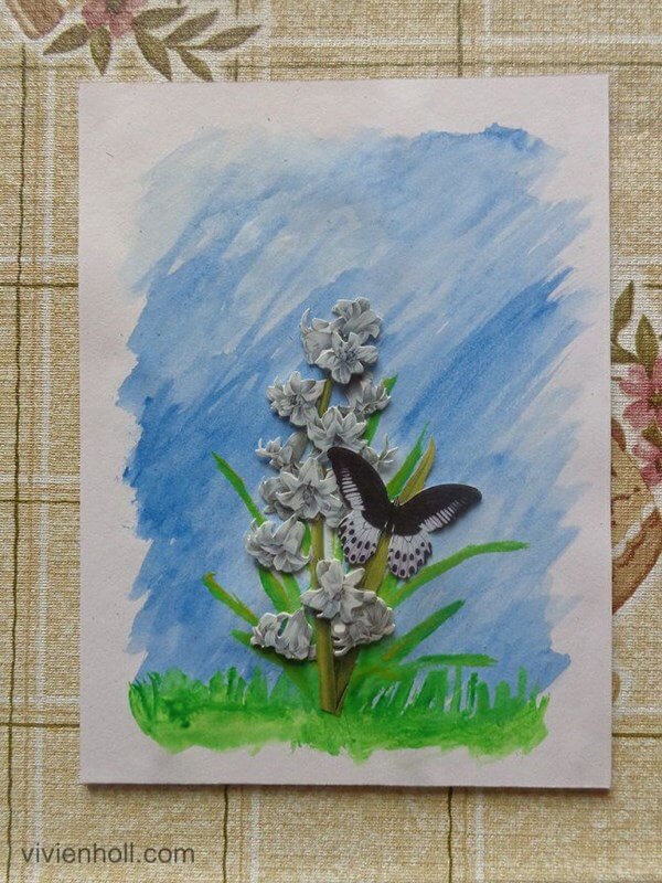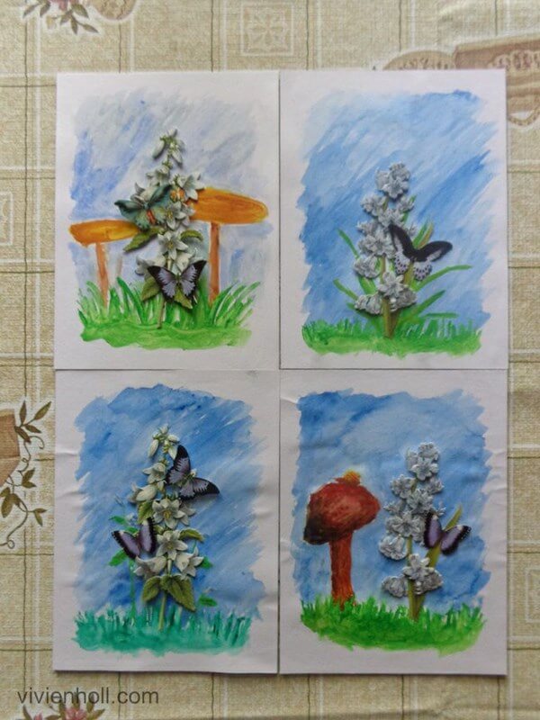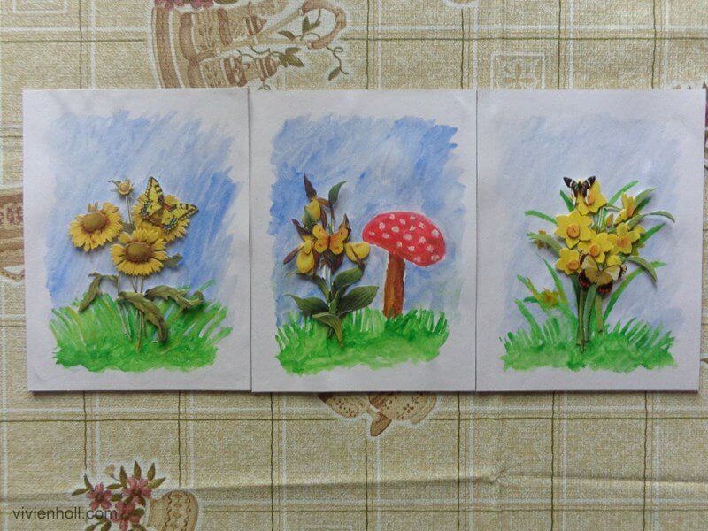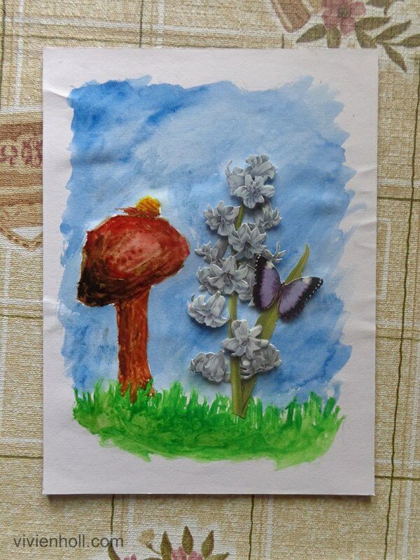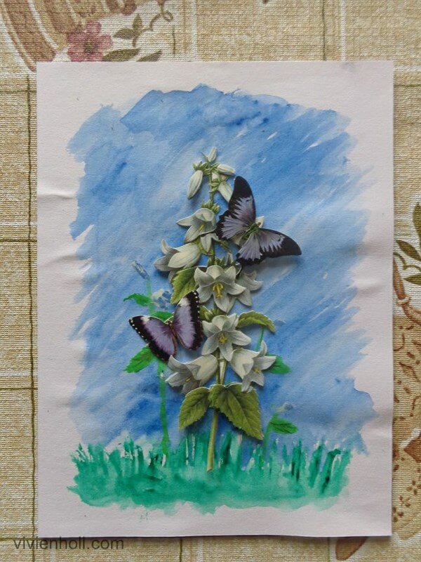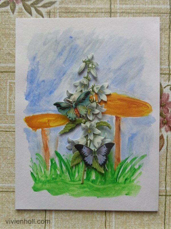 Vagyis akvarellel dolgoztam. Meg ún. ragasztólapokkal és 3D papírokkal. Az egész az egyik nagymamám szülinapjával kezdődött. A nagyszüleimnek mindig saját készítésű ajándékot adok. Most valami újat akartam csinálni, ezért megnéztem, hogy milyen alapanyagaim vannak. Megtaláltam a 3D papírokat és a ragasztólapokat. Azonban nem volt itthon üdvözlőkártya. Így A/5-ös fotókartonra festettem akvarellel és azt egy vastagabb kartonra ragasztottam. Annyira tetszett, hogy még több „képeslapot” csináltam. Már mutatom is őket: