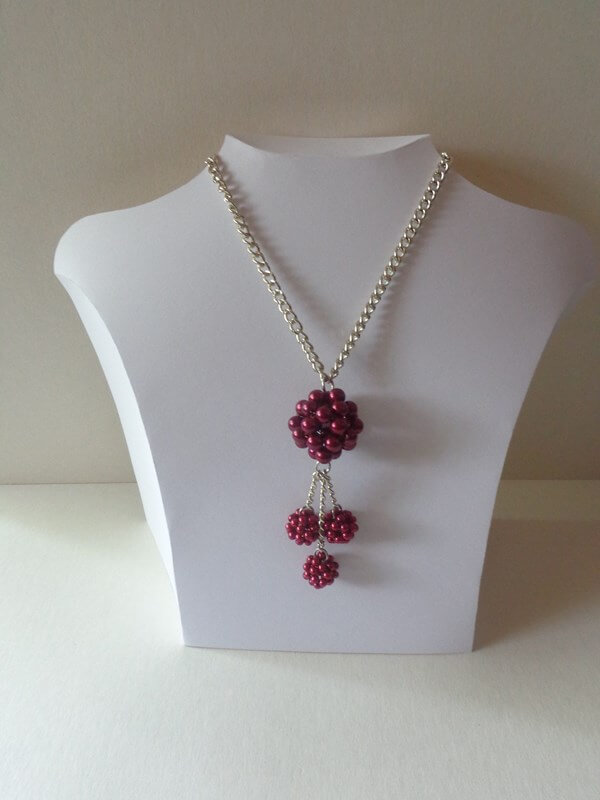 A nyakláncok  4 és 8 mm-es tekla gyöngyökből készültek. Eredetileg csak a bogyókat készítettem cél nélkül, s amikor készen voltam velük, akkor kezdtem el velük játszogatni. Végül ez a három nyaklánc készült belőlük, meg persze még jó pár más dolog, amit később mutatok meg.