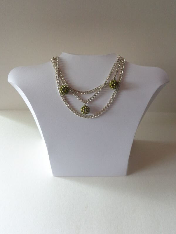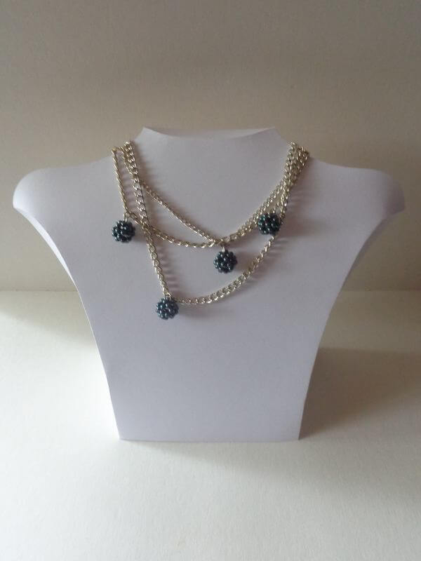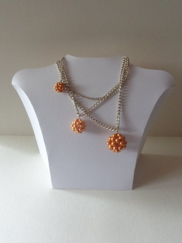 A nyakláncok 4 és 8 mm-es tekla gyöngyökből készültek, hasonlóan a korábbi nyakláncokhoz. Néhány bogyó a mút héten készült, néhány ezen a héten. Végül mind láncokra kerültek. Egy valamit megtanultam múlt héten – s ez mindenkinek egy jó tanács – ha nyakláncot akarsz készíteni bogyókból és láncból, akkor a bogyókat karikával készítsd. Amikor utólag rakod bele a gyűrű, az nagyon nehéz.