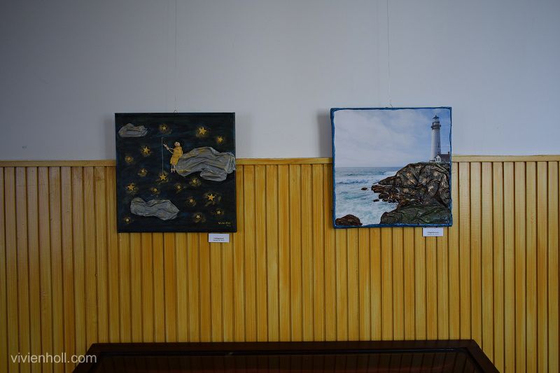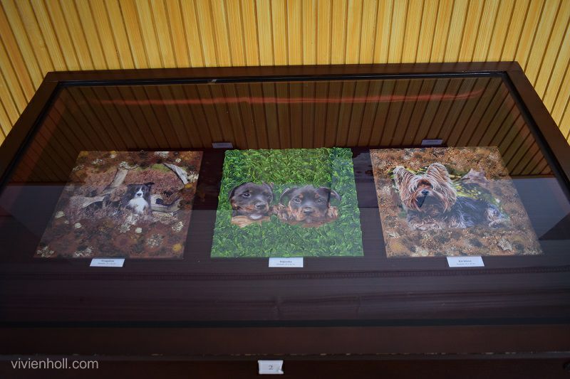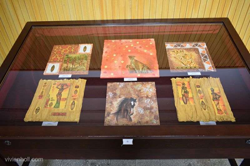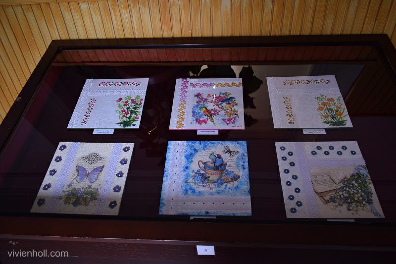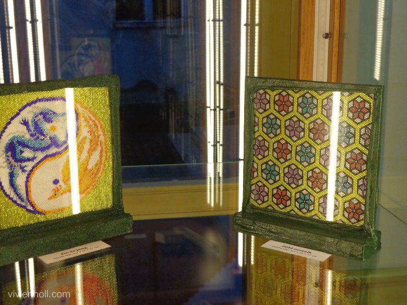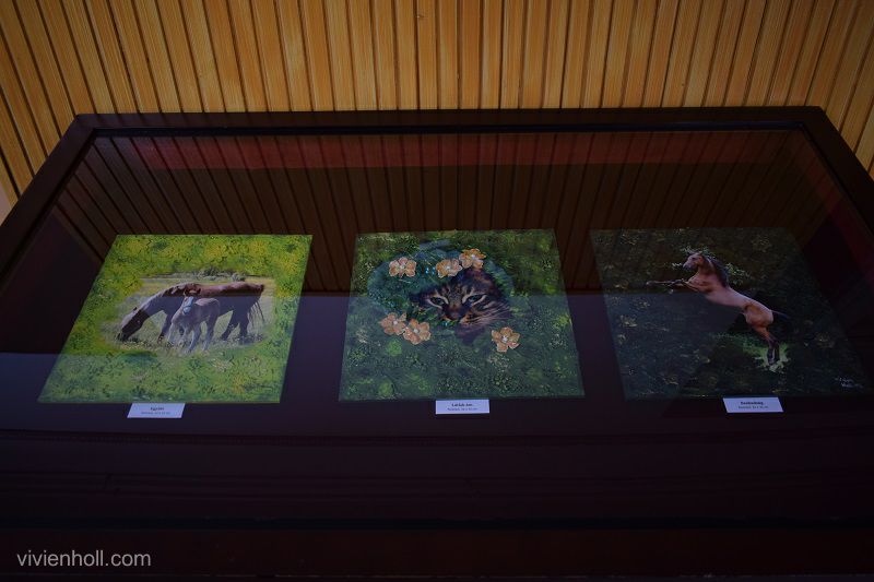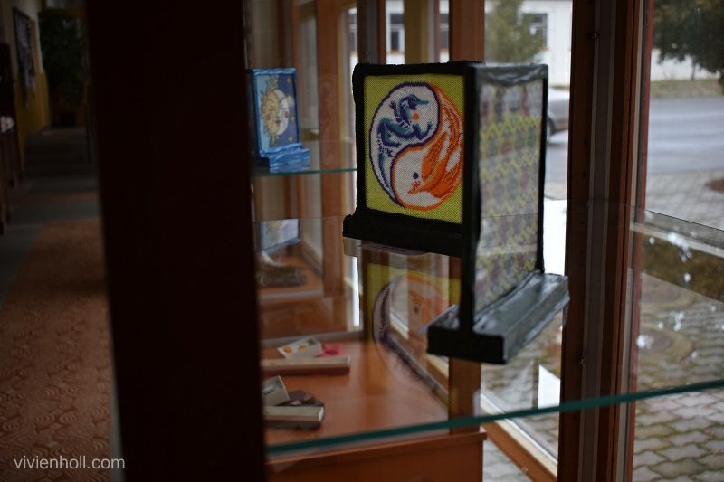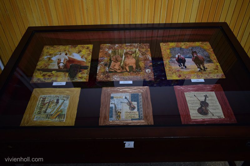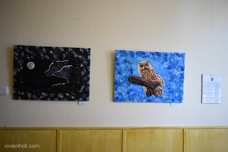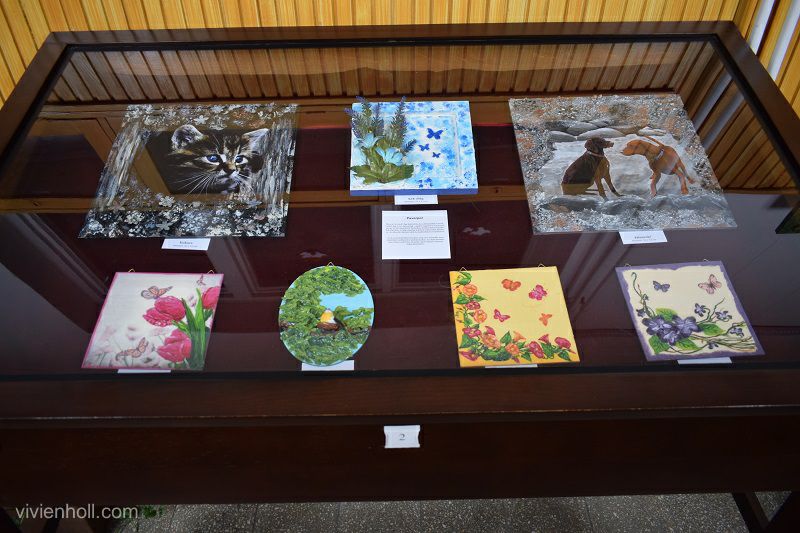A képeket kicsit nehéz volt csomagolni, mivel több kép több centimétert kidomborodik. Az ilyen képeket nem lehet egymásra tenni (a többi is állítva volt), de ezekre külön kellett figyelnem, amikor másnap reggel teleraktuk a kocsit. Majdnem egész délelőtt az alkotásokat tettük fel illetve ki – 6 fekvőtárolóba, 3 álló vitrinbe és sok-sok képet a falra. Miután kiosztottuk, hogy melyik falra melyik kép kerül, utána berendeztem a tárolókat és a vitrineket, illetve kiosztottam a címkártyákat. Amikor elmentem, akkor még csak a fele kép volt a falra rakva – mivel a legtöbb képemen két akasztó van, így dupla annyi idő kellett hozzá. Itt szeretném megköszönni a könyvtár munkatársának a segítséget!