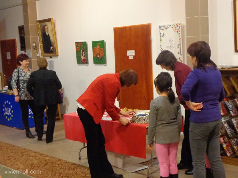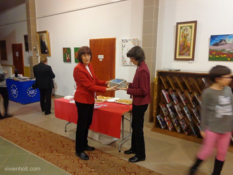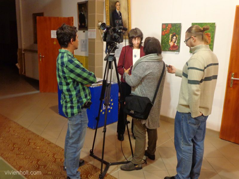 Pénteken eljött a várva várt nap… Kb. másfél órával hamarabb ott voltunk – még egyszer mindent leellenőriztünk, készültünk az állófogadásra – egy kis rágcsálnivaló és innivaló. Izgultam, hogy vajon hányan leszünk, mivel ráadásul esett is az eső… Aztán megjöttek a helyi tévétől, majd két újságtól is. Miközben adtam az interjúkat, lassan érkeztek vendégek is. Végül pár perccel 5 után édesanyám megnyitotta a kiállítást.